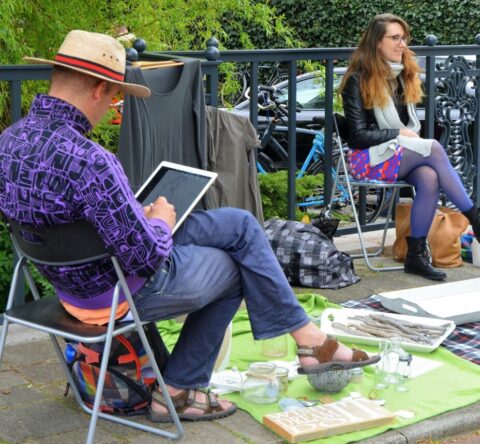 Dit live tekenen is, wat ik het leukste vind om mijn tijd aan te spenderen. Zo leuk zelfs, dat ik regelmatig met de bakfiets (waar een bus stoel op zit gemonteerd) de stad in fiets op teken avontuur.